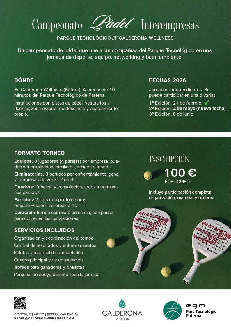 Una iniciativa impulsada por la EGM Parc Tecnològic Paterna junto a Calderona Wellness, pensada para conectar empresas a través del deporte, el compañerismo y un ambiente inmejorable.